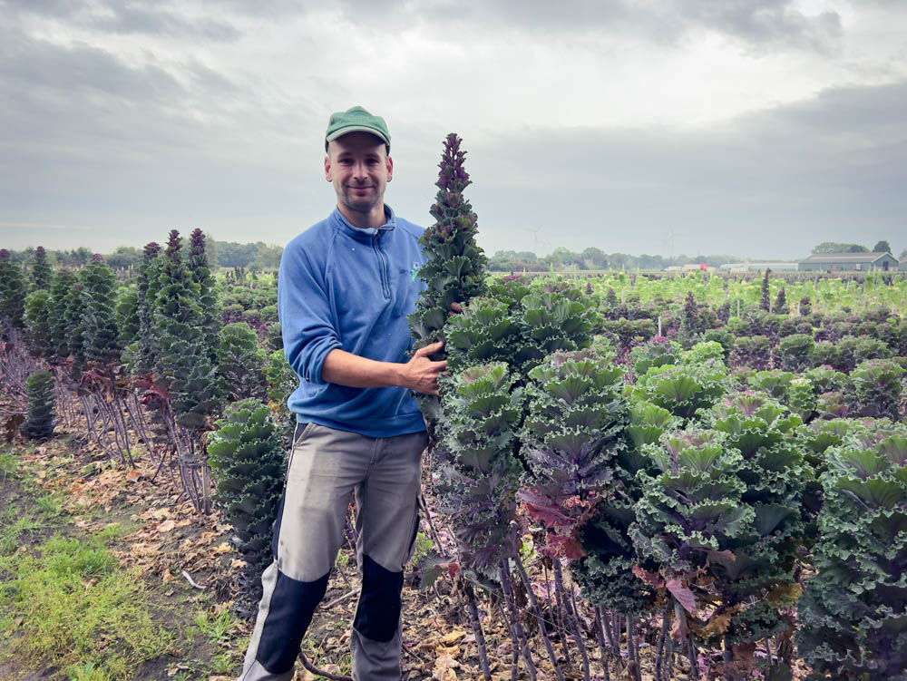 Frank draws up the cultivation plan, does fertilisation, selling ornamental cabbage and human resources. His father is responsible for land preparation and crop protection work and his mother for farm hygiene. The farm has a flat company structure, everyone is involved in everything. The tasks change by part of the day and throughout the season. He starts in the morning as a forklift driver, then he is HR manager and, after the coffee break, cultivation supervisor. After the lunch break, he stands replacing a pipeline while answering phone calls with dirty hands. In the evening, he makes a quick round of the fields to irrigate or create a feeding trough and chase away some more game. So no two days are the same.